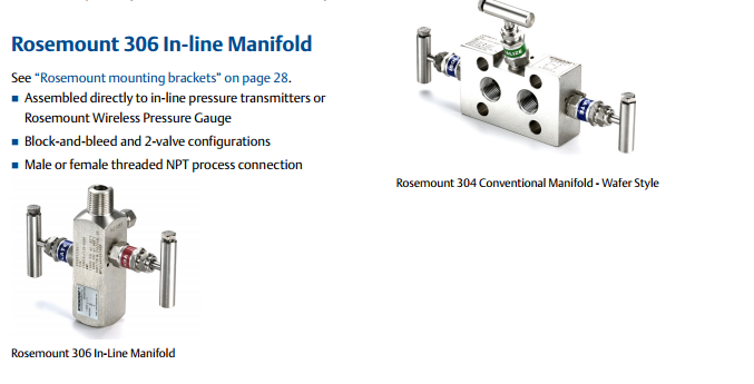 The Rosemount 306 In-Line Manifold is engineered for in-line transmitters. This manifold comes with a male or female threaded NPT process connection and assembles directly to pressure transmitters and gauges for simple in-process calibration. Featuring block-and-bleed and 2-valve configuration for instrument isolation and drain/vent capabilities, this manifold comes factory-assembled to transmitters and gauges, leak-tested and calibrated.